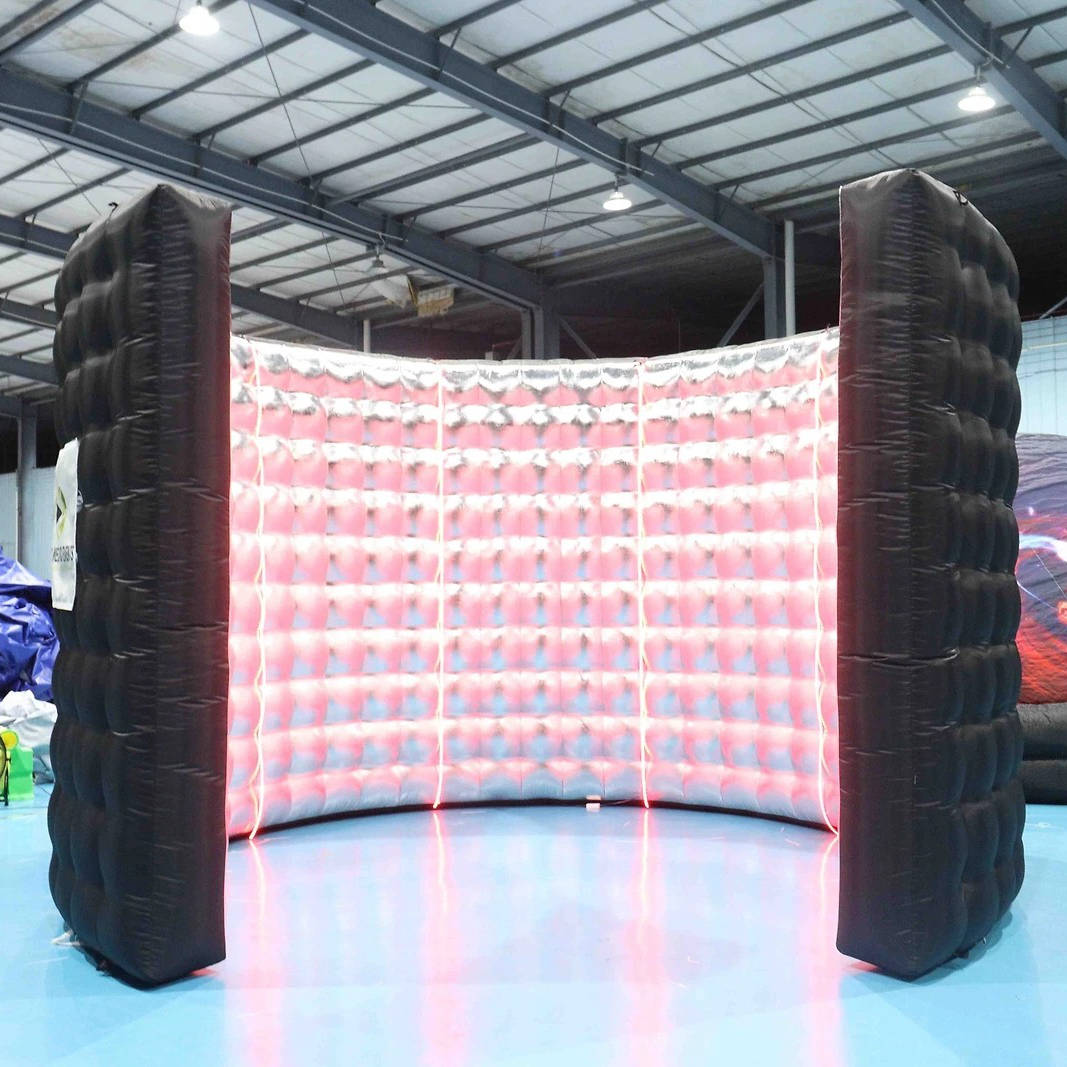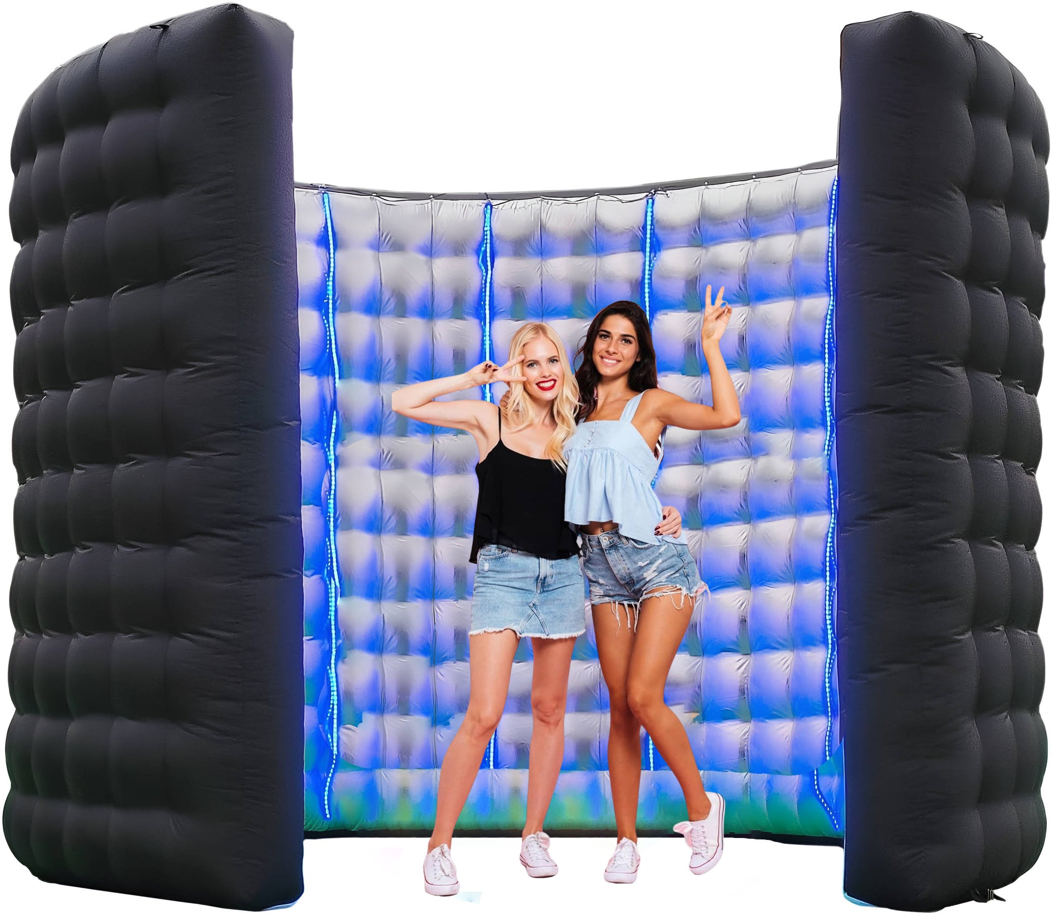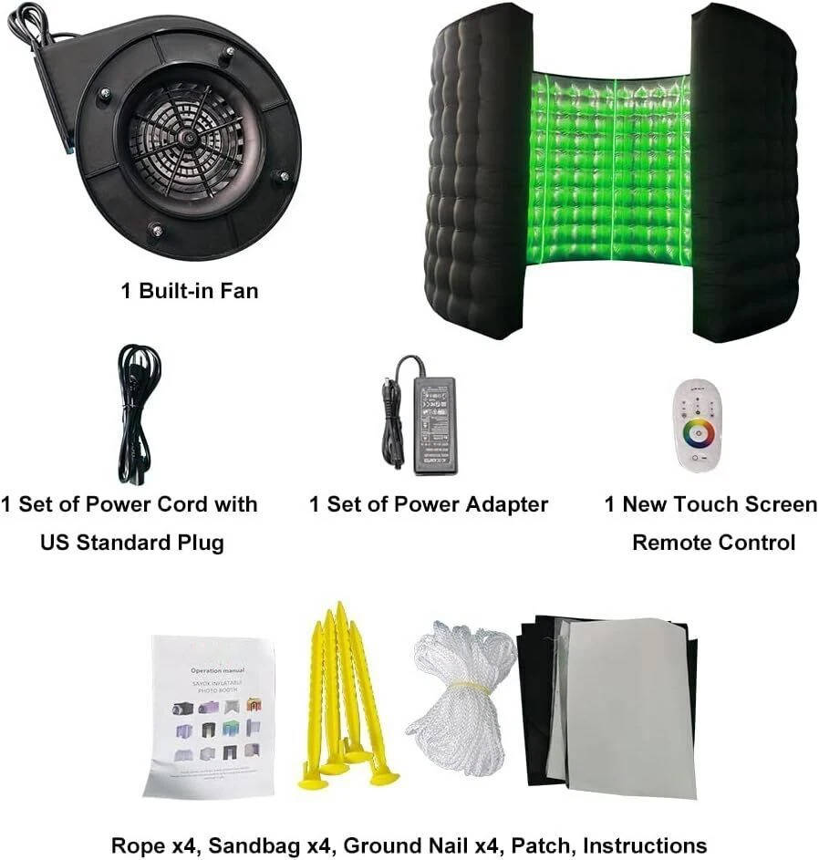 The booth inflates automatically using a powerful built in fan system within minutes. Guests step inside while LED strips illuminate the silver reflective walls with vibrant colors. The touchscreen remote lets you customize lighting effects for each photo session.
