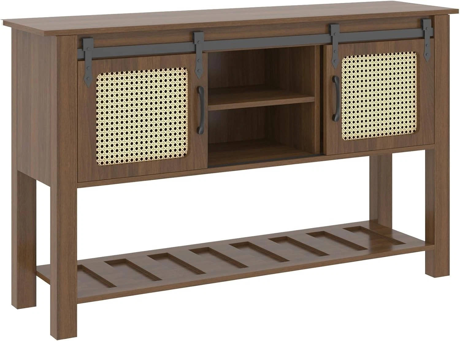 DUAL RATTAN SLIDING DOORS: Two sliding barn doors glide smoothly to reveal organized storage while adding farmhouse charm to your space.
