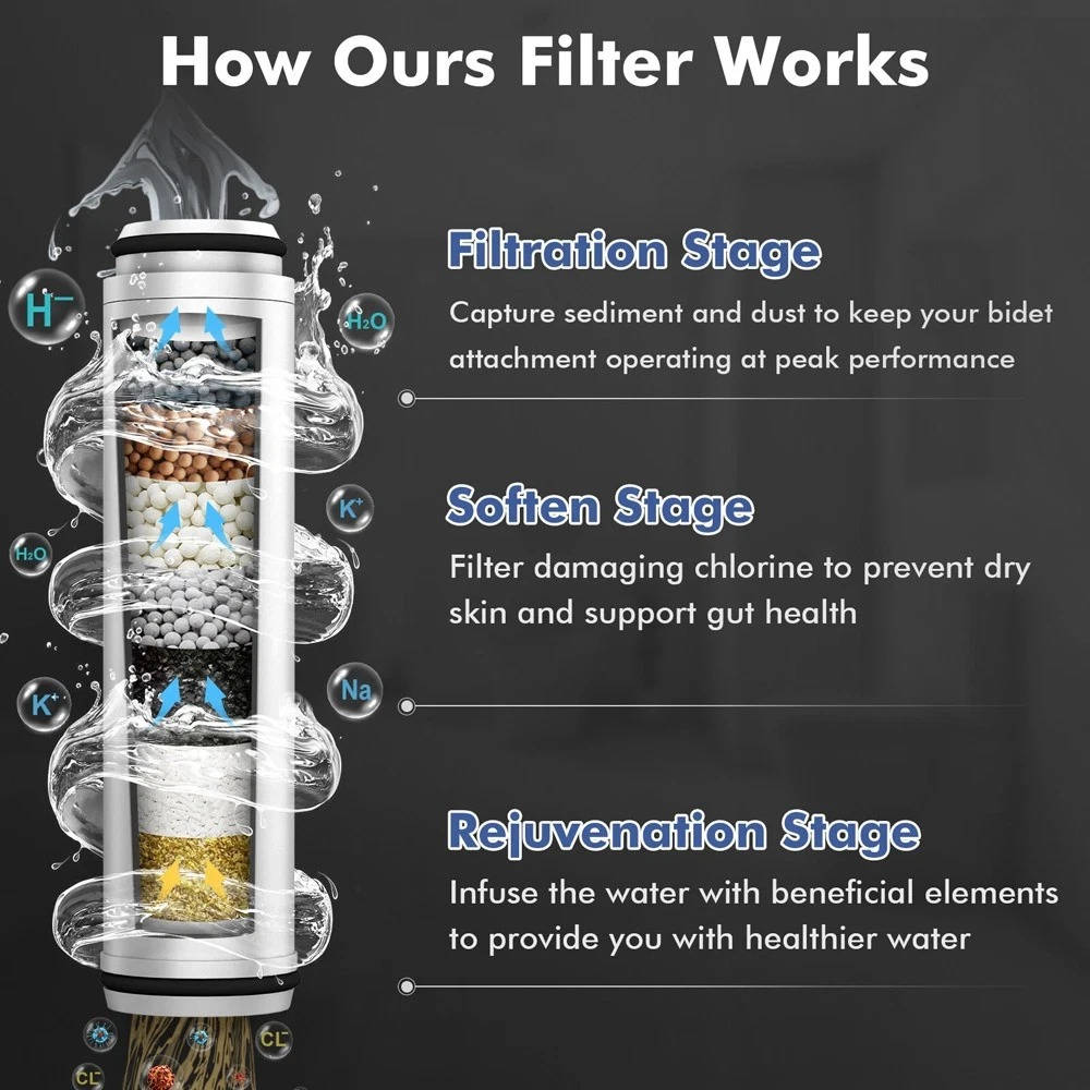 THREE STAGE WATER FILTRATION: Captures sediment, removes 99.99% of chlorine, and infuses beneficial minerals for cleaner, healthier water with every spray.