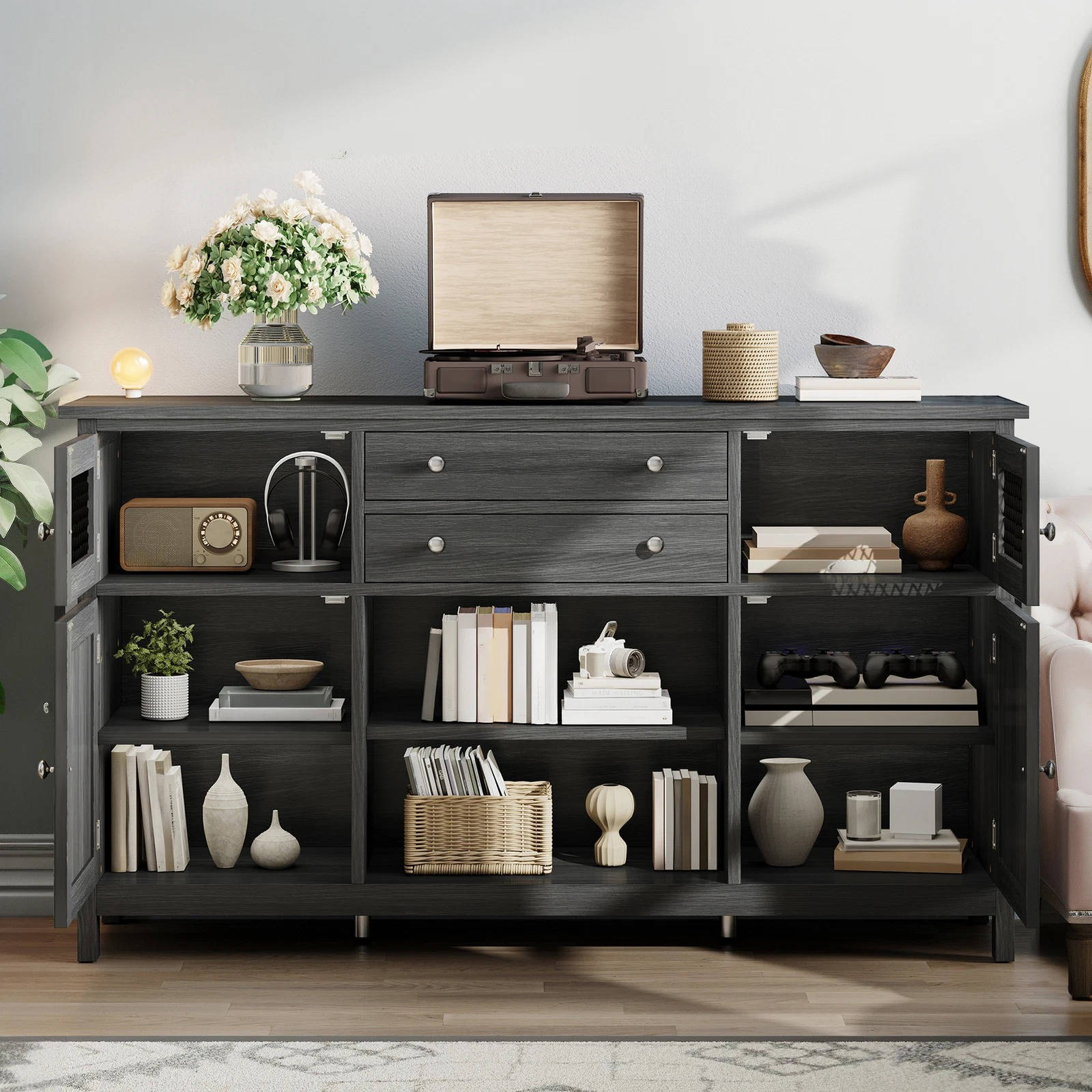 That's not all! Four doors give you quick access without crowding your walkway. The adjustable shelves fit tall pitchers, stacked bowls, and bulky storage bins. Plus, you can use it as a hallway cabinet, TV stand, or sideboard depending on your space needs.