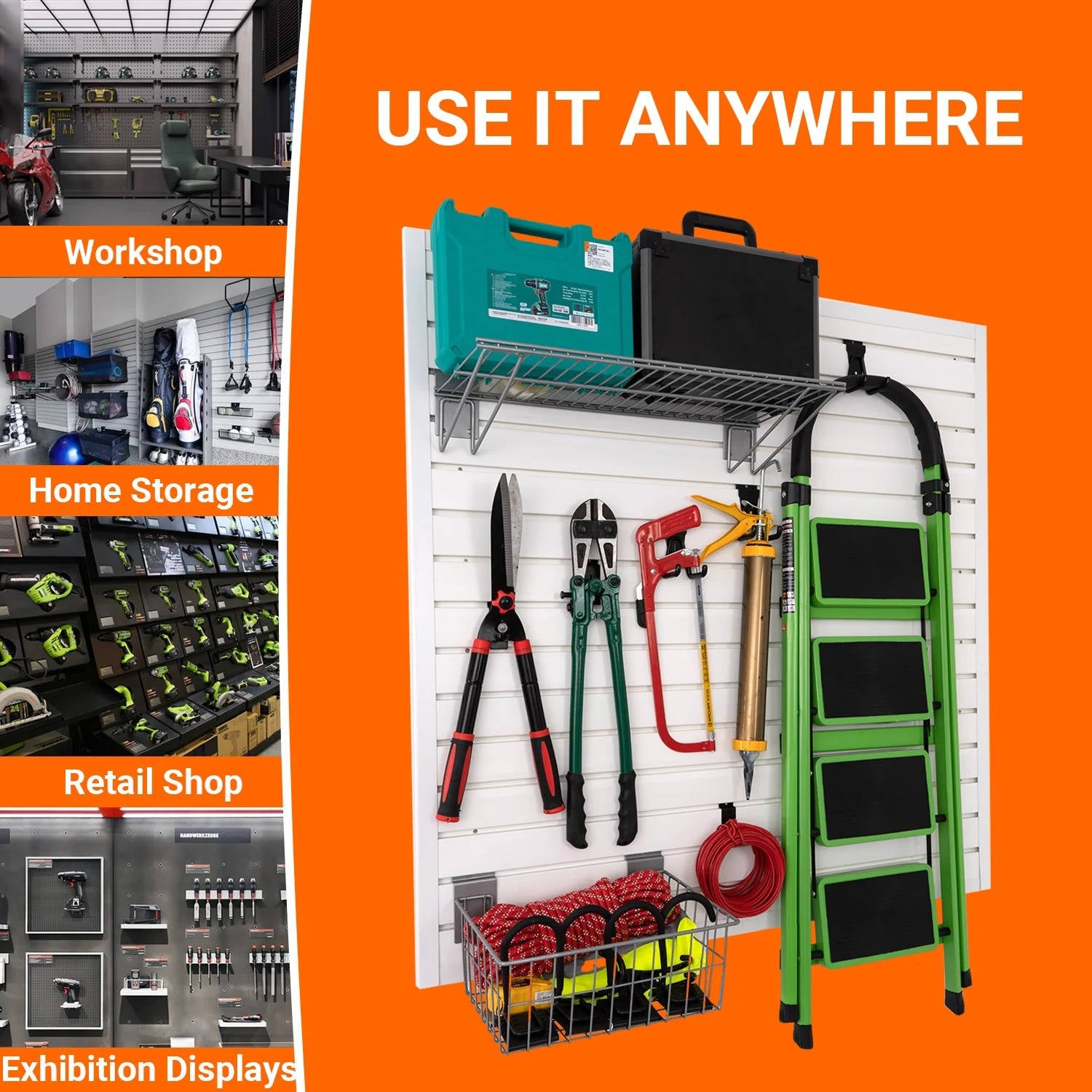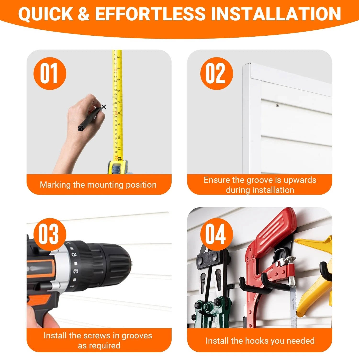 Screw the panels to your wall using the drill bit and screws that come with it. Click them together with the builtin tabs to cover as much space as you want. Drop hooks, shelves, or bins into the slots, and move them around whenever things change.