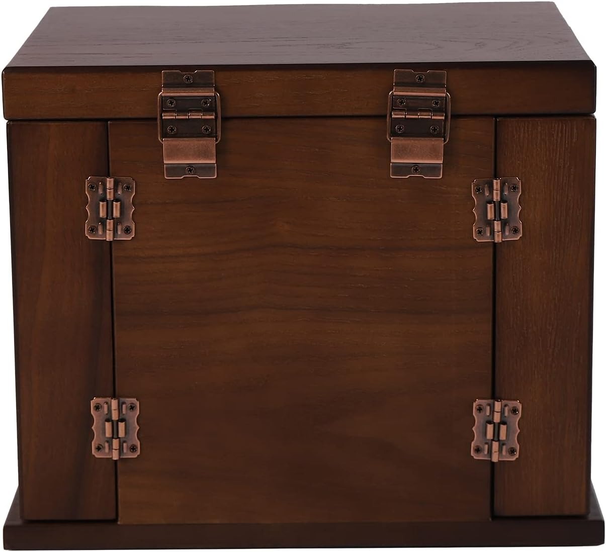 Open the doors and you'll see hooks and slots on the inside wings for hanging pieces. Pull out any of the four drawers to reach sorted spots for rings, earrings, and bracelets. Lift the top tray to find small divided sections that keep everything separated and easy to see.