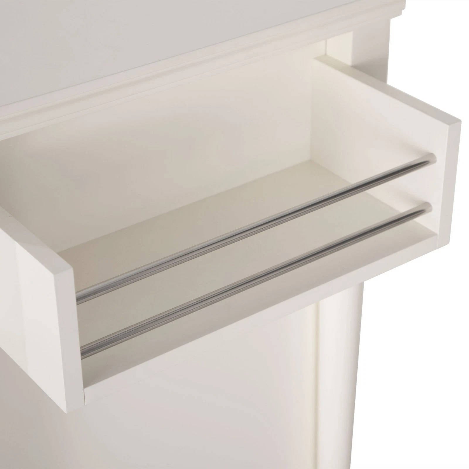 You get two drawers that slide easy, two doors, and three open shelves for your toaster, mixer, pots, and bowls. The towel bar keeps your kitchen towels close without taking up counter space. Made with MDF and pine wood with a painted finish that lasts and wipes down quick.