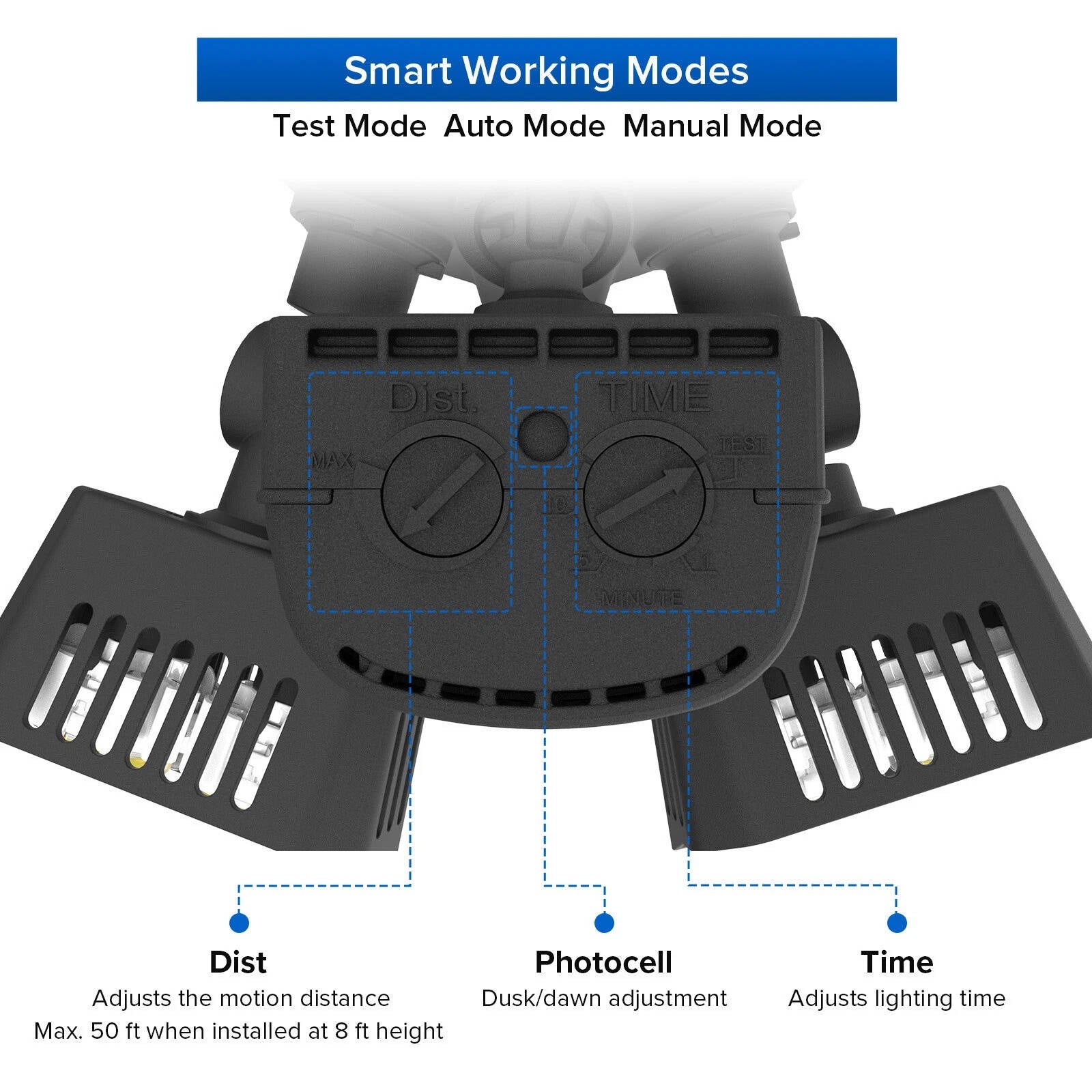 That's not all! IP65 waterproof handles rain and sprinklers, working in temps from negative 13 to 104 degrees. It turns on at dusk and off at dawn automatically. Plus, builtin cooling runs strong for 50,000 hours with timer settings at one, five, or ten minutes.Â