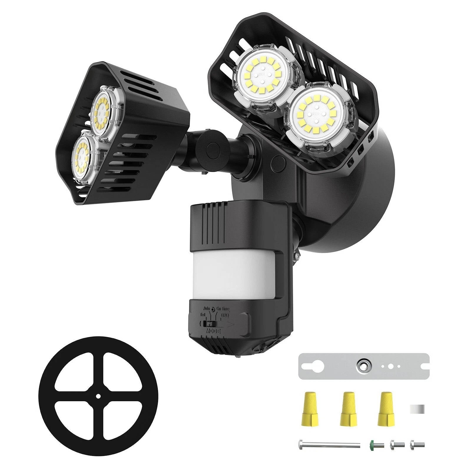 Mount it straight up or sideways with the sensor facing out, between 3 and 13 feet high. It picks up movement up to 50 feet away across 180 degrees, then kicks on. Tilt and swivel each head to aim where you need light.Â