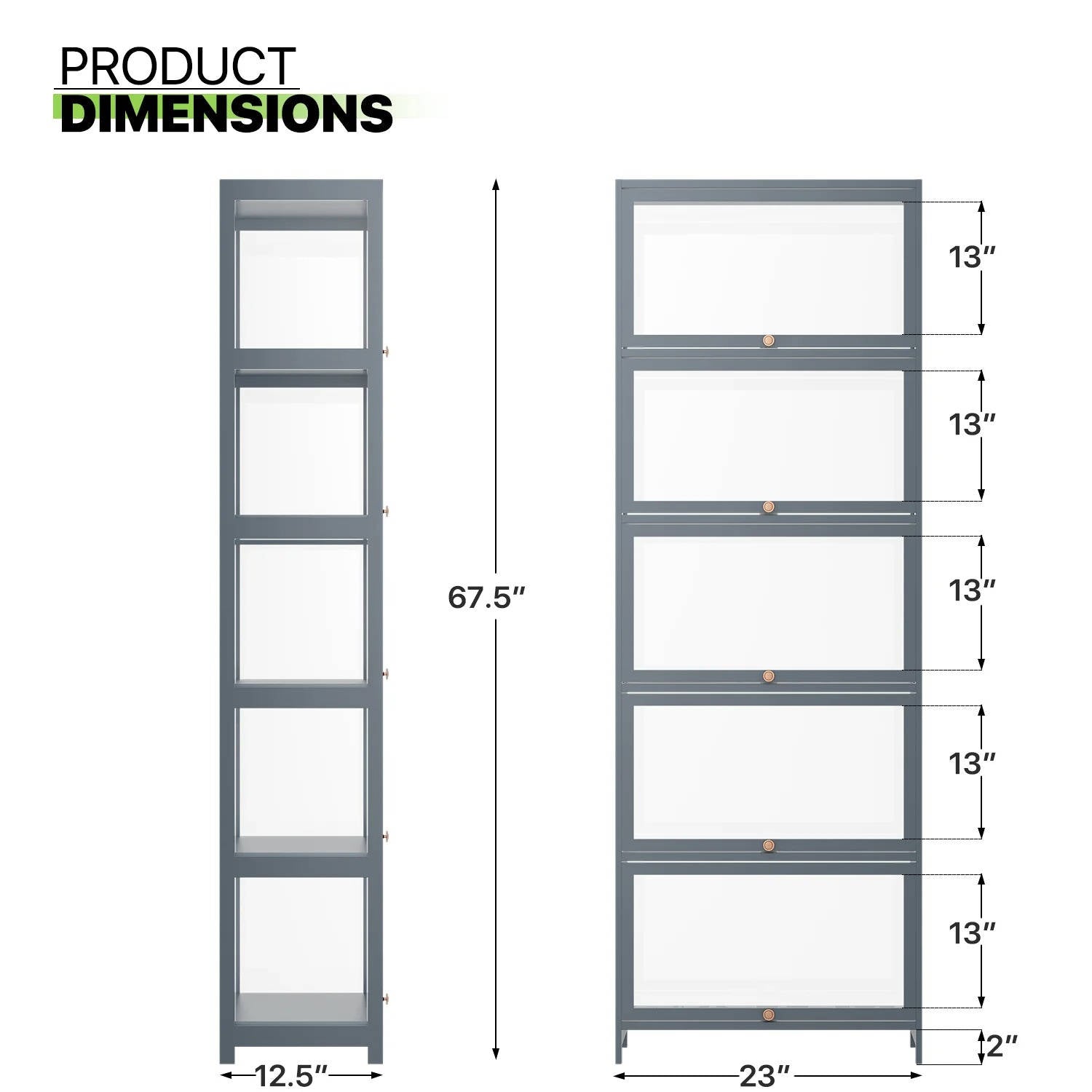 The strong bamboo frame holds everything up while giving you visibility from every angle. You get five shelves with 13 inches between each one, so even taller items fit perfectly. Just flip up the door when you want to rearrange things, and the magnetic closure keeps everything protected.