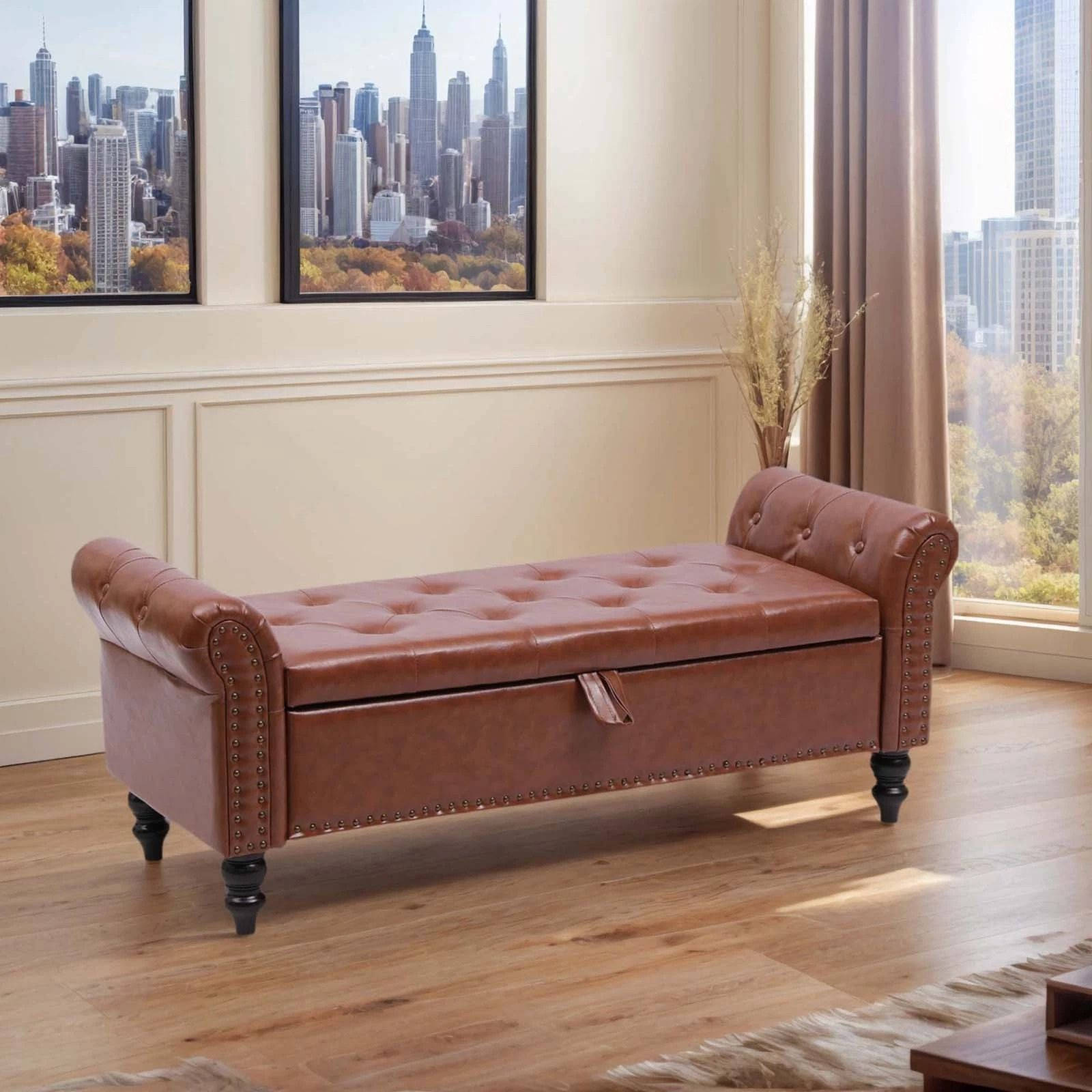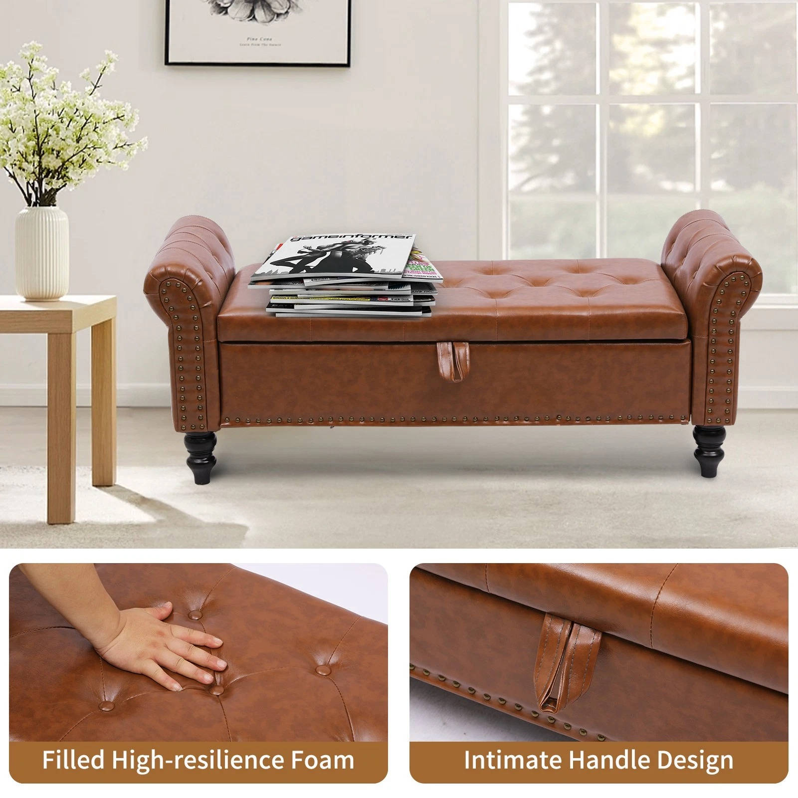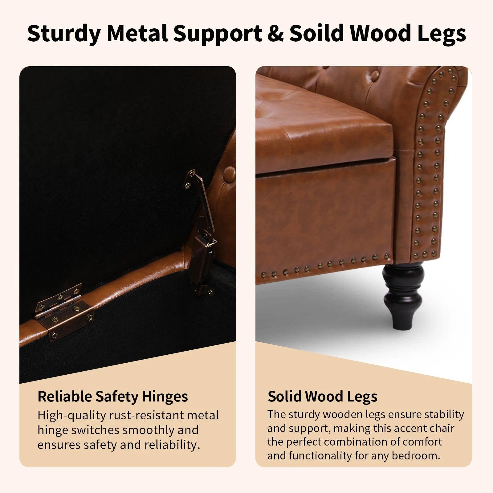 Holds up to 300 pounds and has a big inside space that's 37.4 by 14.8 inches for blankets, pillows, and sheets. The seat has button tufted fake leather with rolled arms and decorative nail studs. Solid wood legs keep it steady, and the hinge opens smoothly.